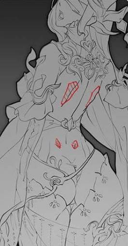 然后就是在上一步的基础上增加体积了,增加体积的方法其实就是把每个部分都上明暗,特别是翼膜的部分,要记得我们上面说过把翼膜当成皮质布料来画,所以在绘制时是可以通过明暗来表现类似的褶皱的,具体方法是在需要画褶皱的位置吸下暗部的颜色,用19号笔刷涂一笔,再吸一下亮部的颜色在原来的笔触上方涂一笔这样很容易就能出这种类似的效果了。