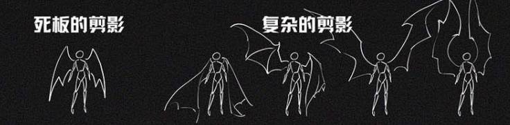 小贴士:动态的运用在另一个画面关键点上也是至关重要的,那就是角色设计时的剪影,要特别注意翅膀和角色之间剪影上所形成的图形感。通过翅膀的多变动态来丰富并且夸张角色的剪影,让整体更有张力。