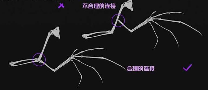 知识点补充:翅膀的三段式是由“大臂”“小臂”“手指”组成的哦,而在正常绘画中,我们会让三段结构以此增长,避免三段的长度平均化。