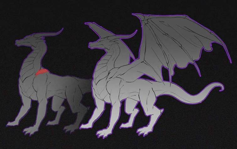 小贴士:既然说到位置了,那就得说说龙翼在其本来持有者一飞龙身上的位置了。如右图所示,常规理解上的翅膀位置是长在飞龙肩膀正上方的位置的,这个位置其实也相当于人类肩胛骨的位置。这点另外提出来说是因为这个小知识点同样适用于其他幻想类题材的动物,比如天马,狮鹫等带翅膀的动物,很多同学在画这类动物时,翅膀的位置总是不尽如人意,有的会画在背的正上方。有的画在肩膀两侧,这样画看起来总是会有点别扭的,画在背的正上方时会让整体翅膀感觉偏高,画在肩膀两侧又会让人觉得偏低。还有如果是飞龙类的翅膀,翅根的翼膜连接位置是比较灵活的可以到腰部位置,也可以到大腿甚至尾巴的位置哦。