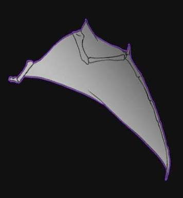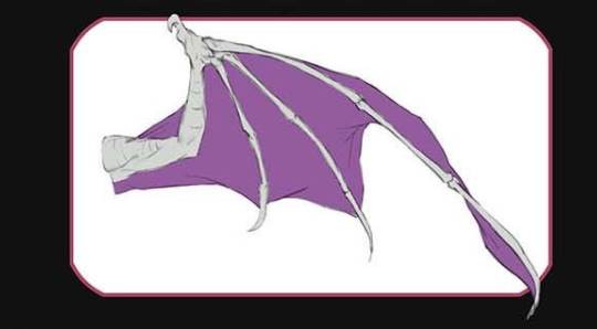 这次我们要绘制的是龙翼,翅膀的大小样式虽然有很多,但就像我们前面说的一样,都是三段式的骨架结构。所以绘制时首先我们要用线稿确定大致的比例和动态,要注意“手指”之间的连接要用曲线连接,如果用直线连接会显得很僵硬,很机械缺少生物感。并且翼膜因为是有厚度的,所以在非完全展开的情况下,是会因为折叠产生褶皱的,思路就跟布料或者皮是一个道理哦。