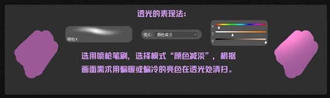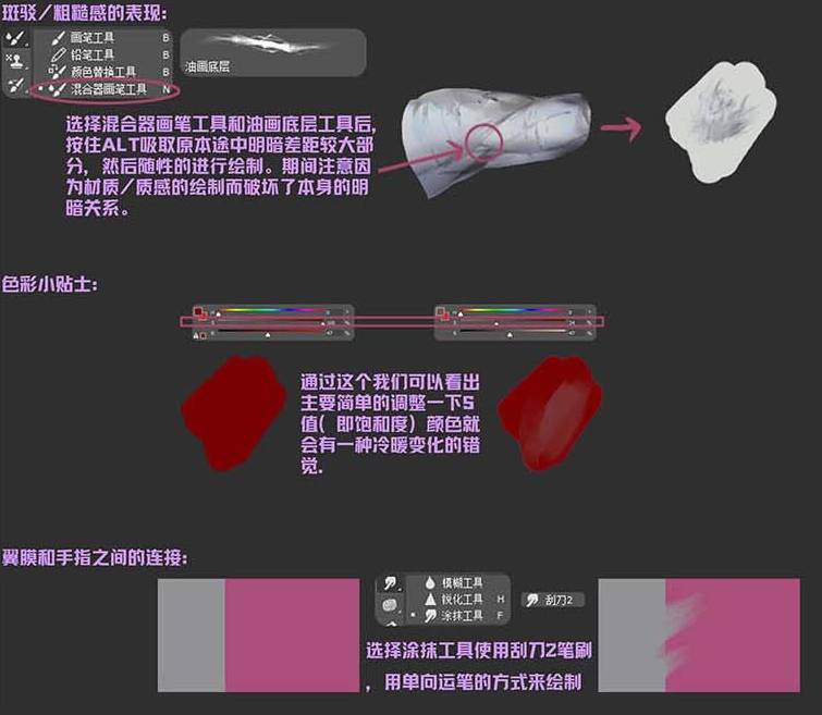 接下来这一步可以进行初次细化了,因为这绘制的是龙翼,所以在质感的表皮上可以用混合器画笔做点斑驳感,并且用19笔刷画出些鳞片的感觉。并且同时调整色彩的饱和度以此来达成简单的色彩变化。并且这里需要注意翼膜和手指之间的连接关系要表达出来,还有就是之前只是简单的画出明暗关系的翼膜的褶皱也要进一步画出亮部和暗部,增加体积感。