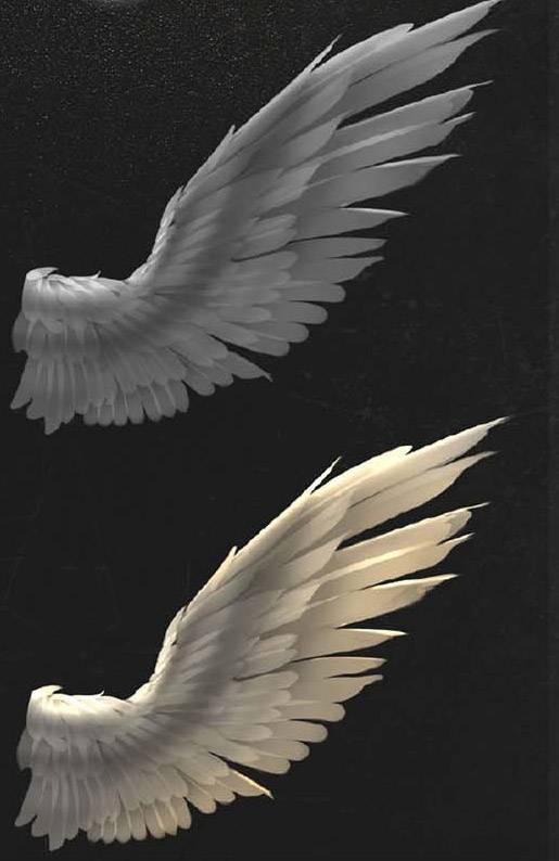 这一步所用的笔刷全程为神之19号,再做过渡时可以适当利用喷枪完善。整体绘制下来所花费精力还是会比铰多,在梳理羽毛造型的同时,还要兼顾到羽毛与羽毛之间夹缝的透光效果,所以请务必耐心去梳理这一层关系。只要耐心梳理出来了,整体翅膀的光感效果就很明显了。翅膀的完整度也会同时提高。