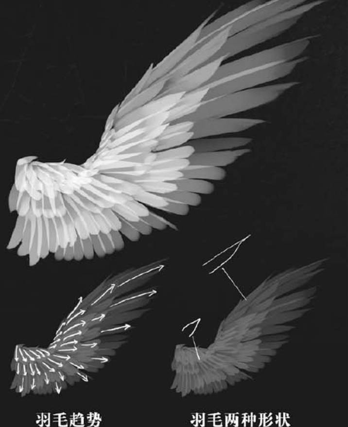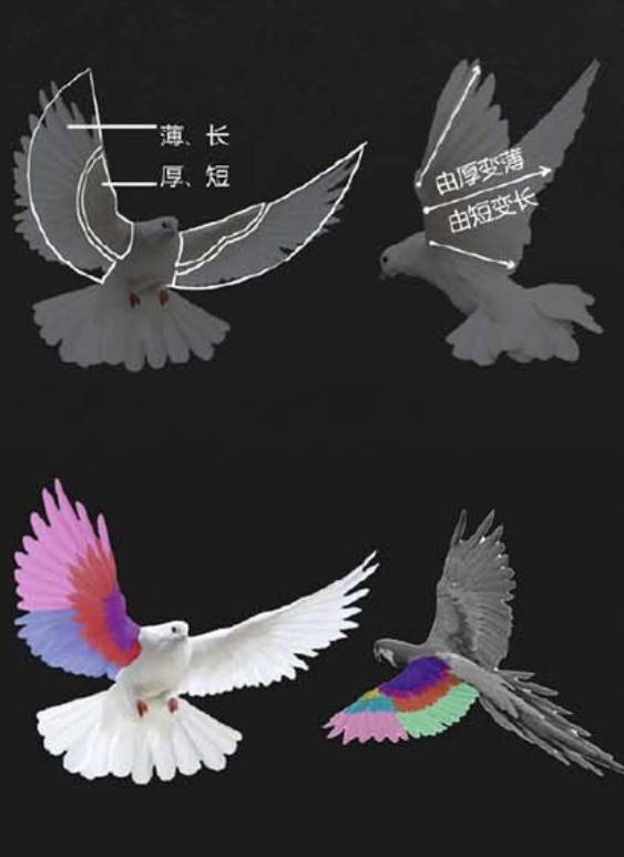总之大家只要先了解白鹆的翅膀结构,就能够顺势推导出天使羽翼翅膀的结构。至于其他鸟类的翅膀,大家可以先不用了解,等到以后需要绘画到特定的种类翅膀时,再去找对应的参考也不迟。