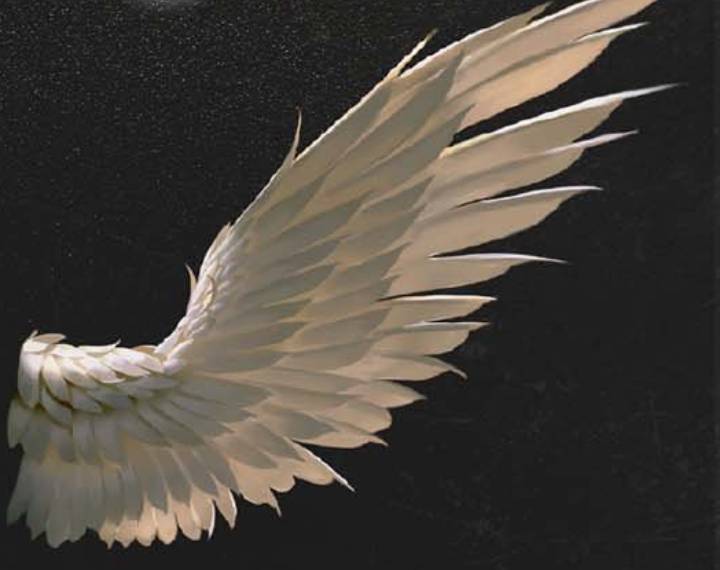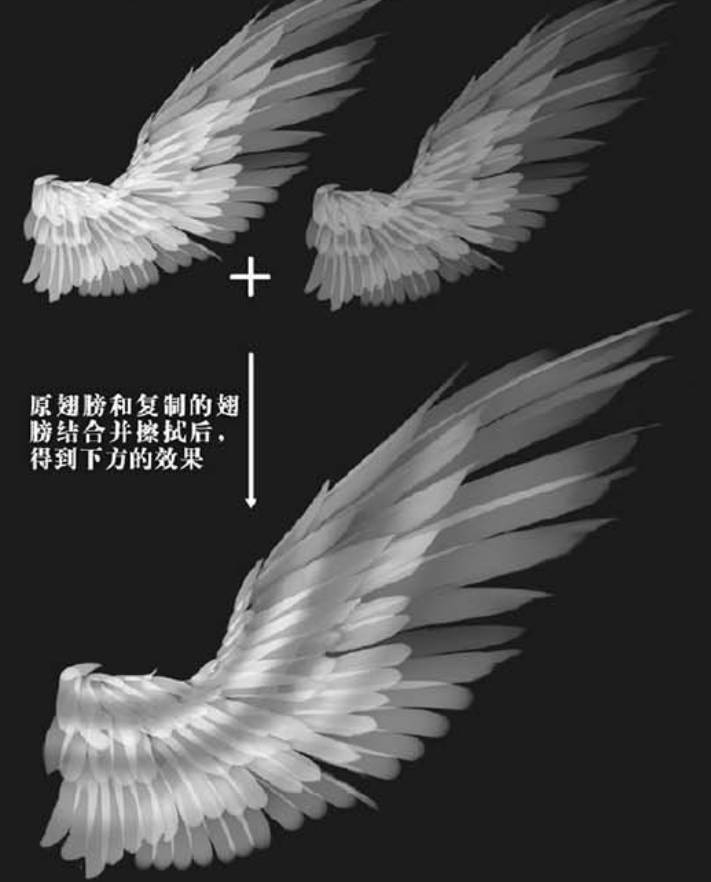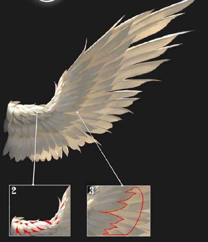 根据上述的羽毛画法,利用神之19号笔刷一笔一笔地画出羽毛的层次(翅膀羽毛内侧一共有34层,每一层的羽毛摆布的趋势要注意,切记不要把羽毛画成平行的了,它们组合都是有角度的,发散式的)大造型出来之后,再完善每一根边缘的造型,不要留有笔刷原有的造型痕迹。