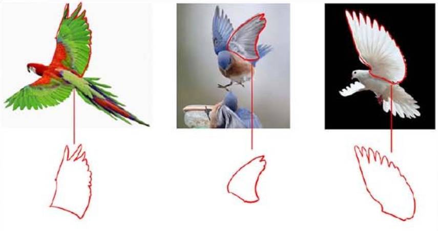 红线勾勒的翅膀有长短、大小、轮廊起伏、透明度等不同。虽然是在不同的角度和动态下,但是也不妨碍我们直观地感受到它们之间的变化。