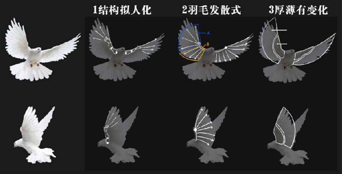 以人的胳膊结构去记忆翅膀的结构,分为大臂、小臂手这三块结构。但注意在长短比例上千万不要画成和人的比例一样咯。因为直观上鸟类小臂的部分会比大臂长出很多。但是运动轨迹上和人类几乎没有太大的区别,只是在伸展的过程中没有办法像人类手臂一样能伸直展平。