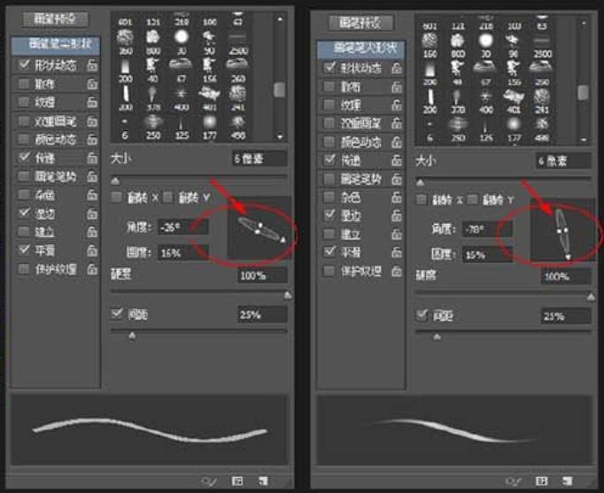 这里要注意神之19号就直接绘画即可,但是斜切由于笔刷自身的造型原因,在绘制羽毛的时候需要不停地旋转笔刷的角度,从而使得角度更贴近羽毛的生长角度(在画笔预设中旋转角度即可,右图红圈区域。不同的角度,笔刷画出的笔触也是不同的,所以大家可以多去尝试,找到最适合的角度)。