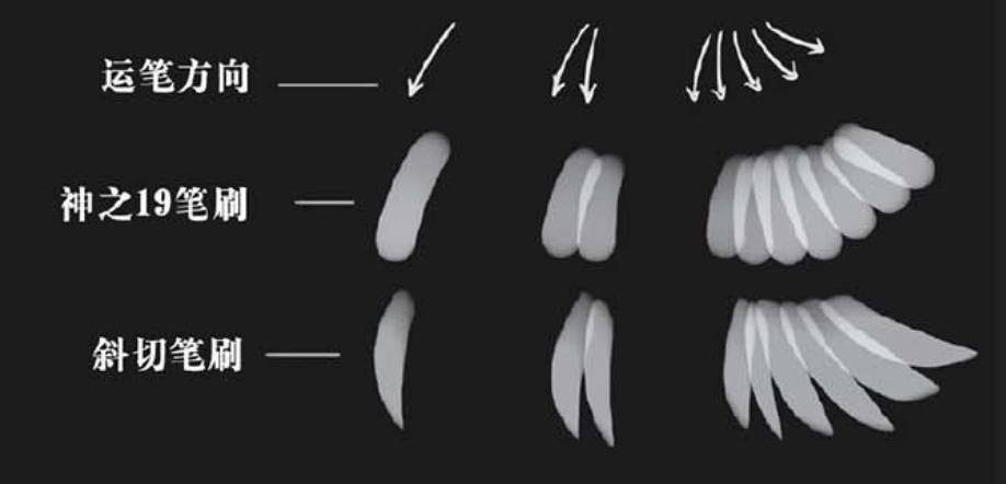 既然如此,笔刷的选择就特别重要了。我们常常会选择“神之19”笔刷或者“斜”笔刷去绘制羽毛部分。
