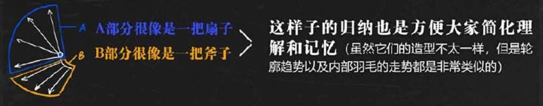 当翅膀张开时,“发散”是羽毛给我们最直接的感受。我们都知道翅膀里羽毛有很多层,但是其实每一层大致的走向都是有规律的,发散式就是它的规律。我们可以简单把翅膀分成A、B两个部分,以及一个节点。