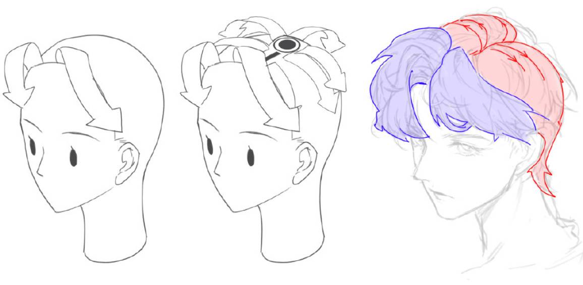 刘海的走向类以,以发际线为起点做出翻折即可,结合可得到岩的走向,并分区绘制出线稿。
