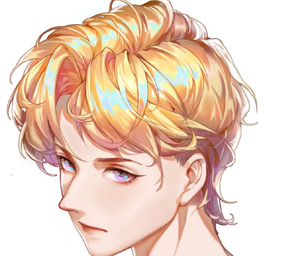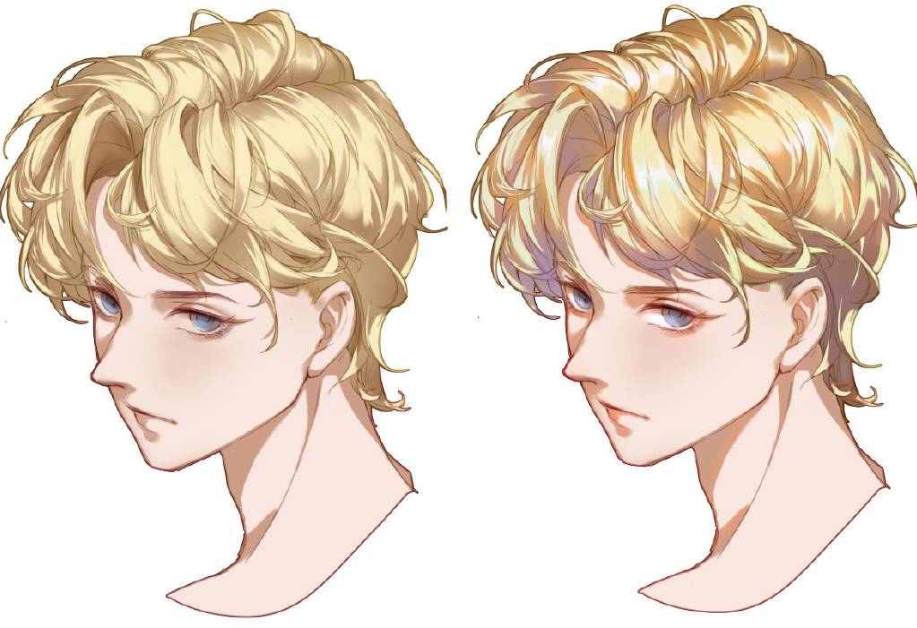 刻画与色形的丰富:将头发之间层叠产生的闭塞点卡深一些,整体轮廓适当压暗,中间受光处提亮一些。为了画面更有冲击力可以选择与固有色黄色呈120度左右的蓝色做高光,