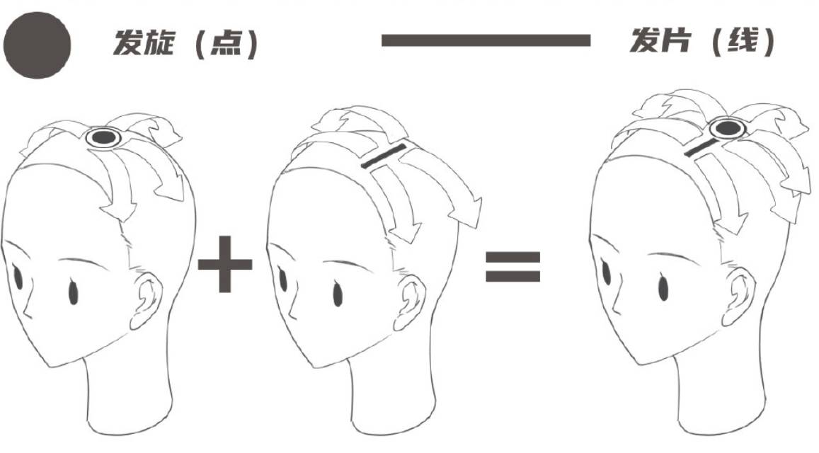 可以先将发型理解为头顶的头发+刘海两个部分。
