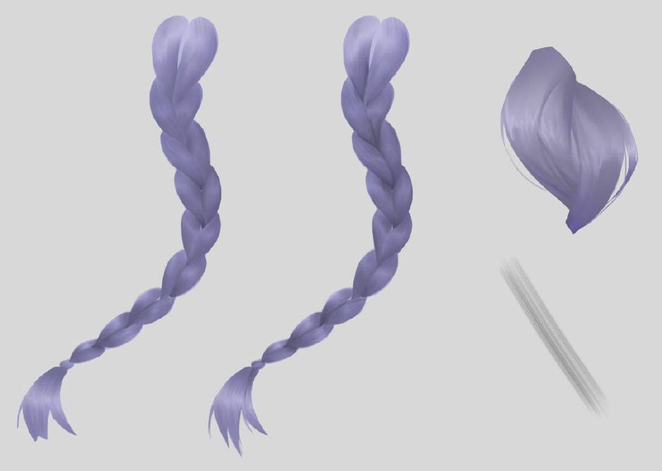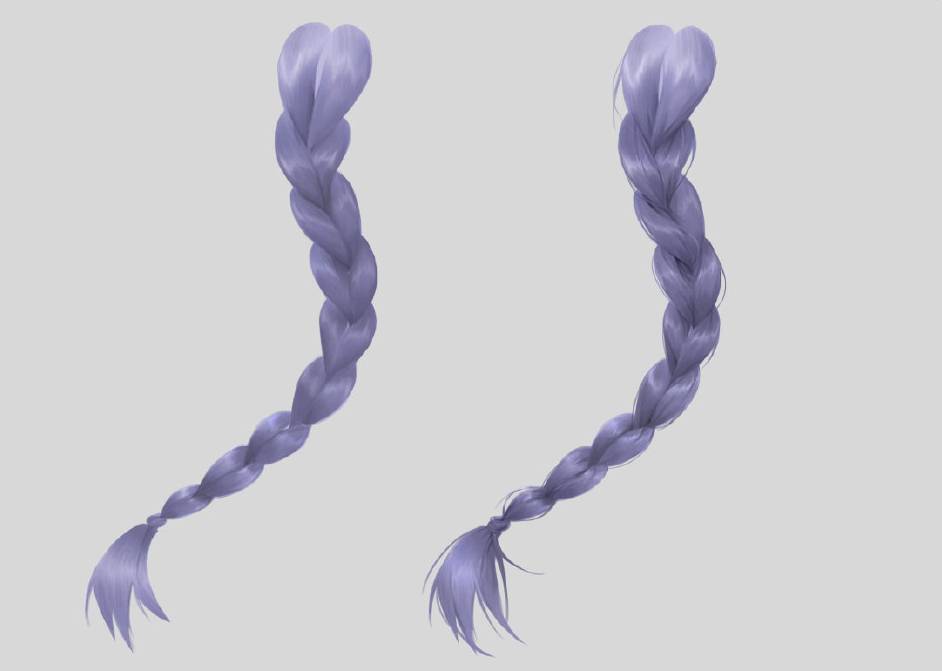 接下来顺着辫子的趋势,用这个画头发特别好用的发丝效果的笔刷(任何类似效果的笔刷都可以)在辫子的上半部和下半部扫出发丝的感觉,这里要选择比较深的颜色。再根据头发的颜色选择一个浅色,用“N”字型的方式画高光。可以在每一股辫子里面也分一些小组,看起来更加细致。