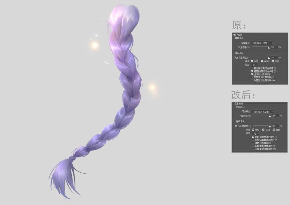 线性减淡图层(需要改图层设置):主要是做出发光效果,在亮部刷一下,会让头发显得更加有光泽。