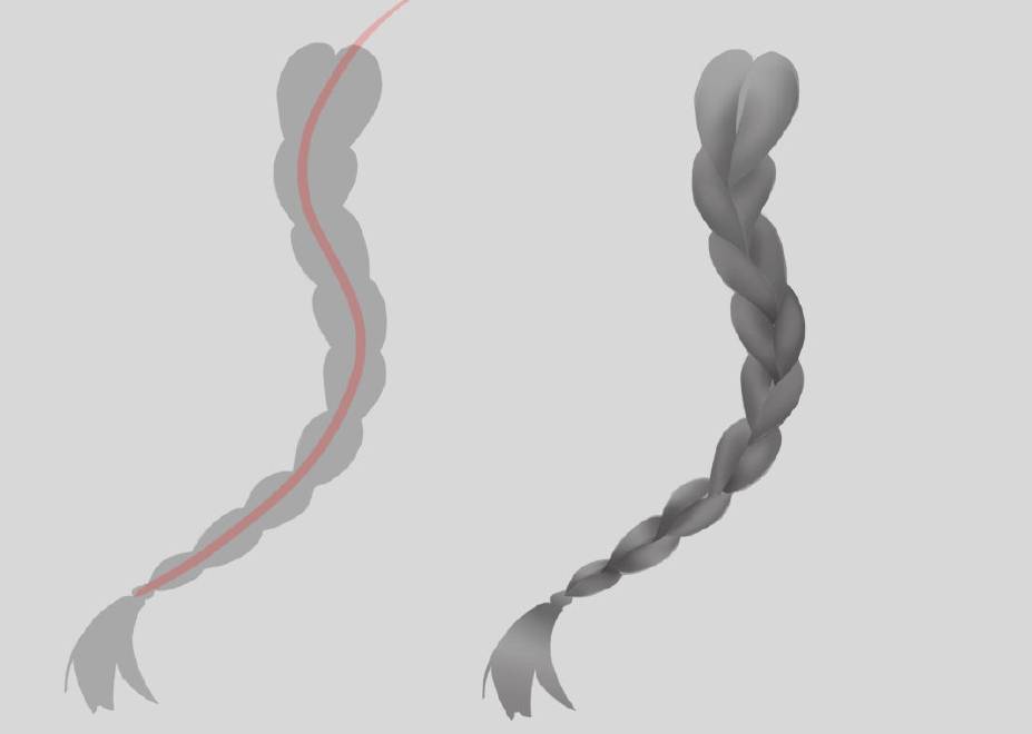 先确定需要画的辫子的大致趋势,可以用中线辅助一下。然后用硬笔用画半圆的感觉,把辫子的轮廓画出来,这一步要注意一下中线的位置哦。然后我们通过“选区”+“喷枪”的方式把辫子交叉的结构也画出来,并且做好基本的体积感。