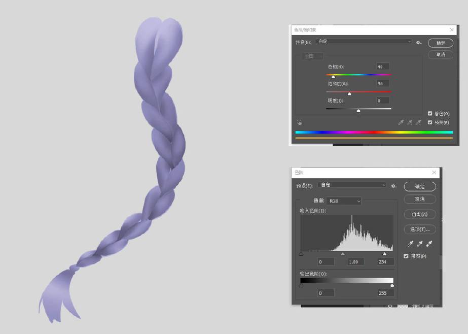 在色相饱和度中选择一个你想要上的颜色,如果由于素描关系的原因颜色看起来太深,可以用色阶来调整明暗关系。