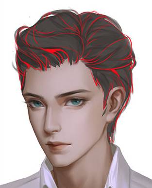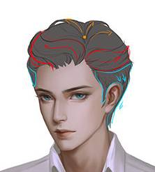 最后一步把虚实关系加强,头发靠后外轮廓适当用带纹理笔刷或者涂抹工具增加空气感。远处部分的头发整体对比度可以弱一点,最深的调子控制在近处的一些闭塞区域。一些分组层次可以通过投影闭塞来强调出来。这样一个背头就基本完成啦~。