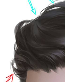 刚开始可以概括地把高光位置明确。通常是处于发缕凸出的部分会有明显的高光,并且靠近发缕高光的位置也会比较接近。高光的形状同样要避免生硬和重复,方向上也可以根据整片发缕的走向来调整为了表现蓬松的感觉,闭塞区域可以安排一些相对大块的形状。