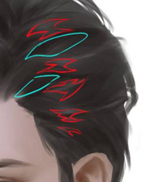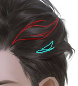 进一步细化就可以把之前比较模糊的发缕形状做的更加明确,尤其是处于靠前位置的部分相对可以更细致一些。高光形状和闭塞的形状也要明确清晰。高光形状通常是工字型,有时候在里面用一些发丝纹理会显得更精致细腻。闭塞的形状也可以通过小的发丝来局部破开。