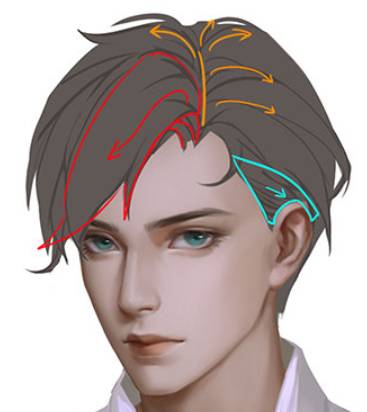 侧分可以两边头发都放下来,但是为了和中分发型区分开,右侧头发可以放耳后,露出发际线和耳发。侧分头发主要是以橙色线为轴线往两边分,一般到了头顶往后发际线会消失,头发方向开始往后长。前刘海可以朝前一下避免头发流向太统一而缺少变化。