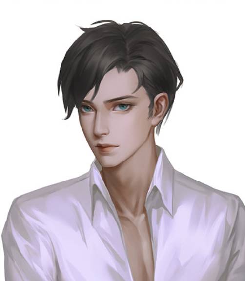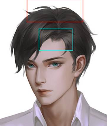 侧分刘海。斜刘海通常整体头发的长度可以稍长一些,发质可以更柔顺一些。同样是底色的基础上用基础画笔大致分组,露出来的发根和耳发同样是需要明确的。斜刘海会有一个明显的头发分开两边露出发根的部分,这里可以透出一些皮肤的颜色。接着上大的明暗调子,把高光的区域大致明确出来了。