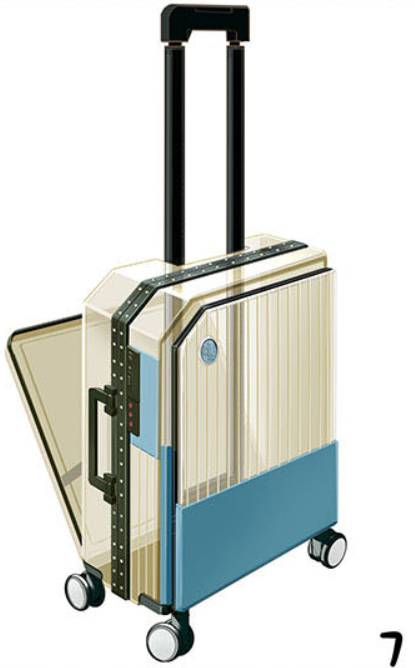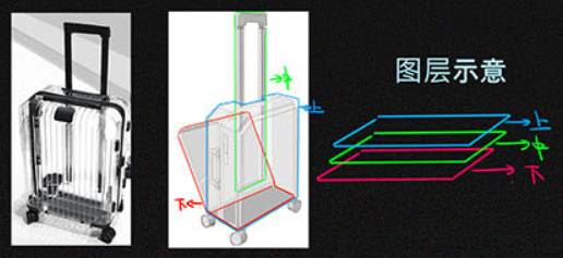 找到透明箱子的参考。图层分布情况如图,蓝色框内为主体部分在最上层,降低蓝色图层透明度至左图效果。绿色图层为拉杆,图层位置在中间,红色图层在最下面。